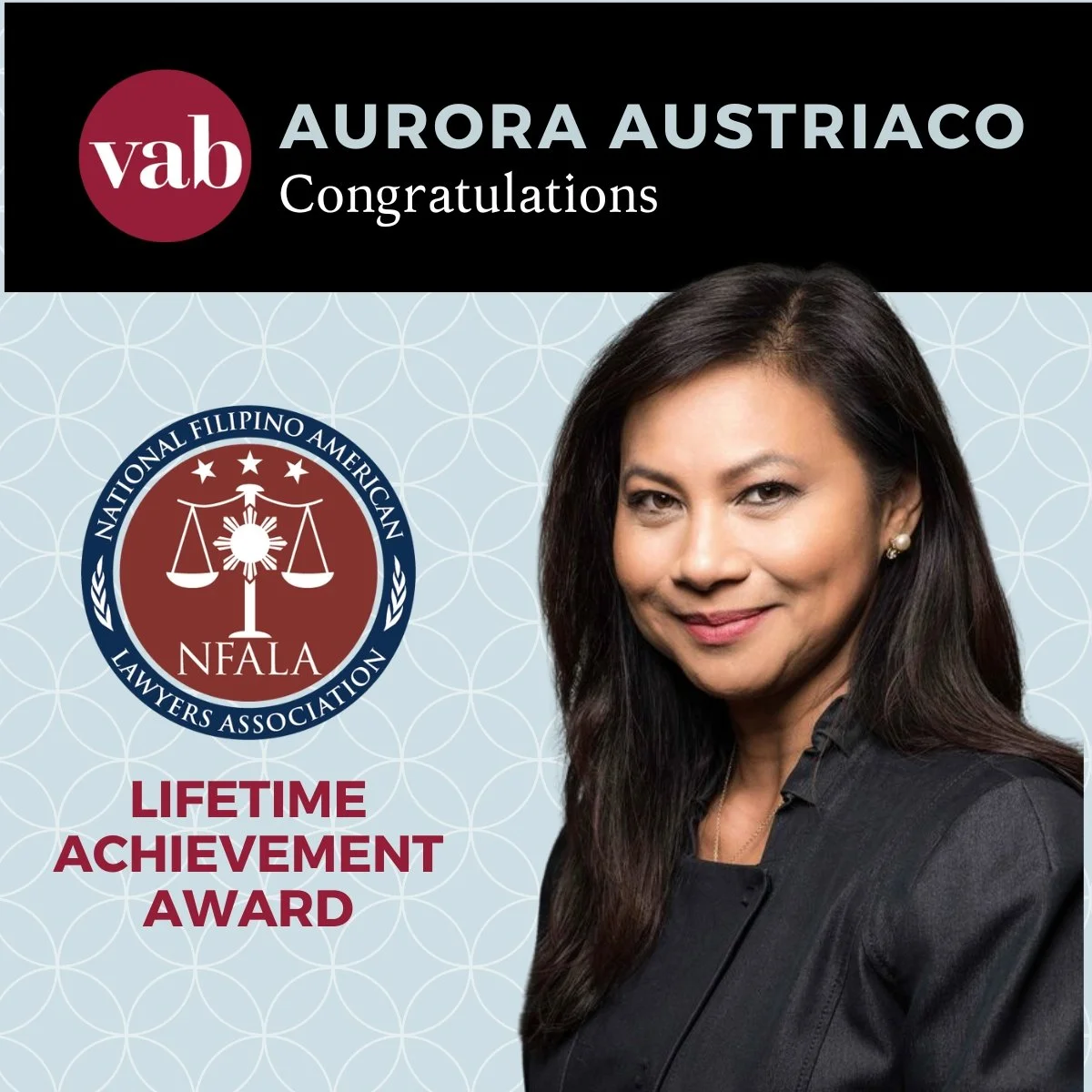 #VABLaw congratulates Shareholder @Aurora Austriaco on receiving the 2025 National Filipino American Lawyer Association Lifetime Achievement Award.